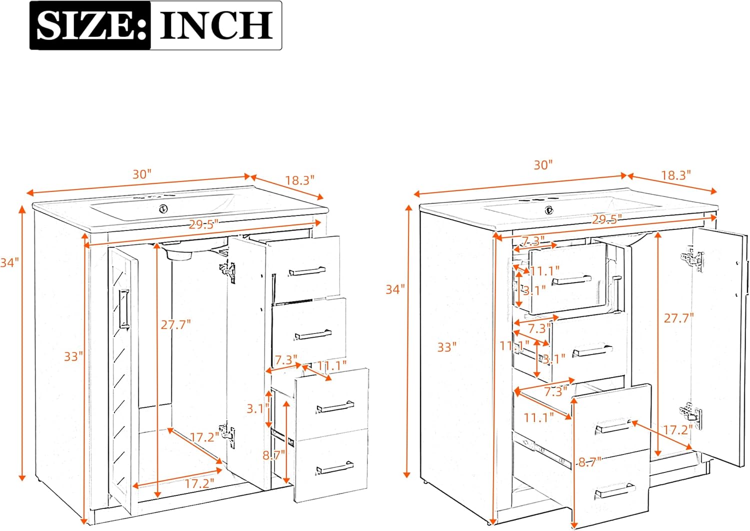 30'' Bathroom Vanity with Ceramic Sink Combo,Solid Wood Frame Bathroom Storage Cabinet This 30-inch bathroom cabinet is made of high-quality solid wood and MDF panels, combining durability and beauty. The unique design not only provides three spacious drawers for you to organize various bathroom supplies, but also comes with a practical storage cabinet to meet your needs for space utilization. Each drawer opens smoothly and is equipped with exquisite handles, which is convenient to use and enhances the overall user experience. The meticulous craftsmanship and natural texture of the cabinet make it a visual focal point in the bathroom, creating a warm and comfortable atmosphere. Whether it is modern minimalist style or retro style, this bathroom cabinet can be perfectly integrated and become part of your ideal home. Let it add storage space to your bathroom while also enhancing the overall decorative effect.
