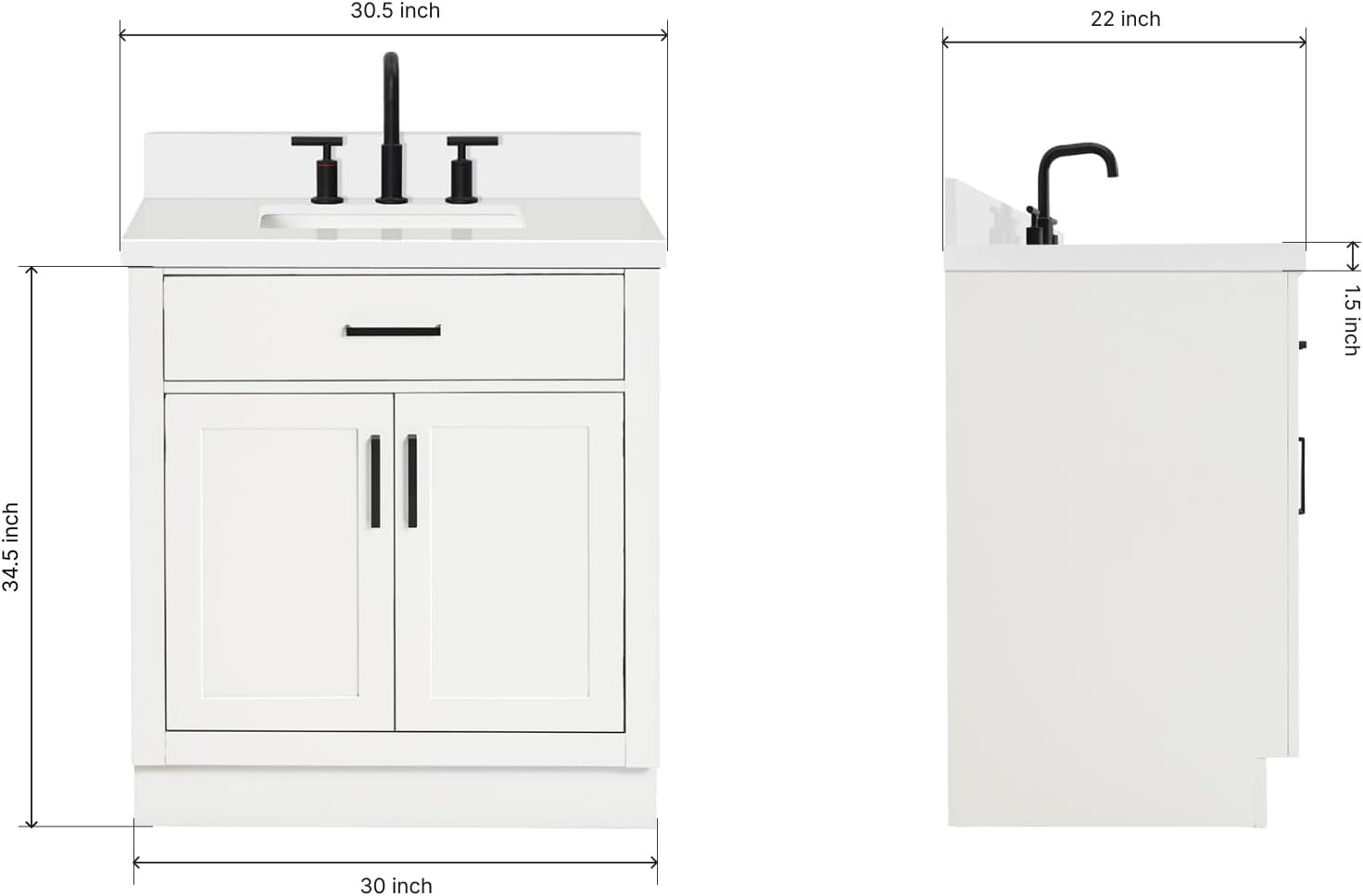 ARIEL 31" Bathroom Vanity with Single Sink, White Bathroom Vanity Cabinet, Quartz Top 1.5" Edge, Solid Wood, Undermount Bathroom Sink, 2 Soft Closing Doors, 1 Tip-Out Drawer, Hepburn Collection