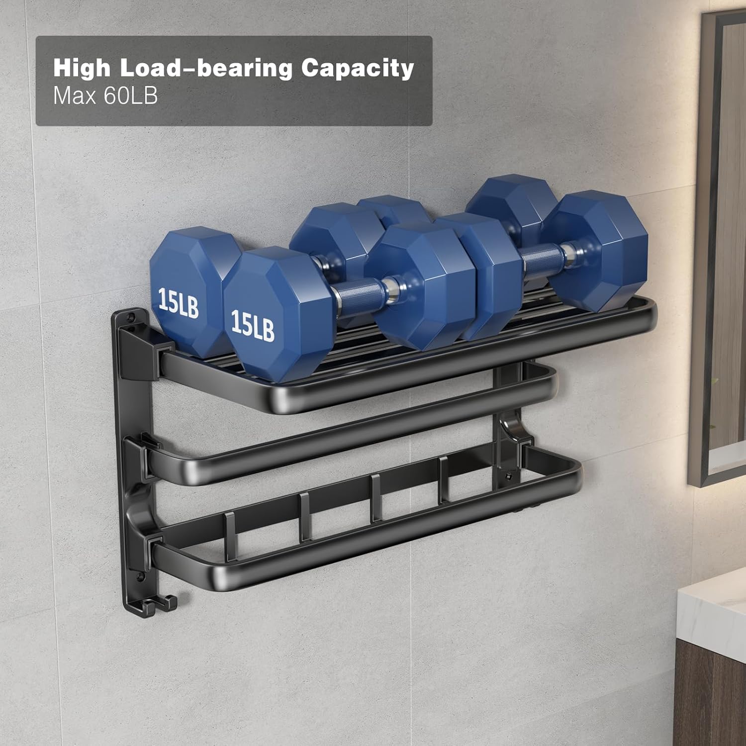 VOLDRA 24-Inch Towel Rack,Bathroom Towel Shelf with 2 Towel Bar Foldable Towel Holder with 7 Hooks Towel Storage Organizer for Bathroom & Lavatory Wall Mounted (Matte Black)